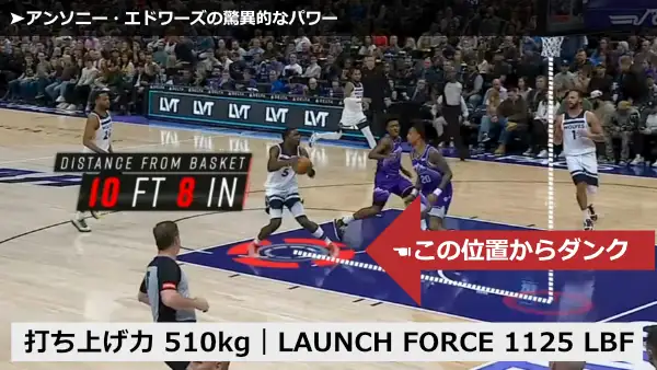 アンソニー・エドワーズがジャンプする際に、地面を約510キログラム重(kgf)もの力で蹴り上げているようです。これは、彼の体重(約102kg)の約5倍もの力を、瞬時に地面に加えていることを示しており、彼の爆発的なジャンプ力の源がいかに強力であるかを物語っています。