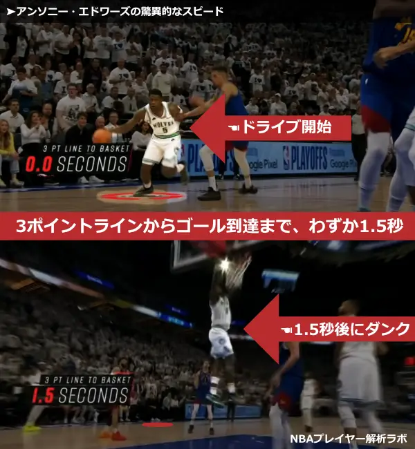 彼のスピードは、ドリブルだけでなくディフェンスとのスペース(間合い)を作る事でも有益のようです。アンソニー・エドワーズの持つ身体能力は、わずか0.5秒で1.5mの距離をディフェンダーからの距離を稼ぐことができる。これは、マイケル・ジョーダンが稼ぐ距離に近いものである。