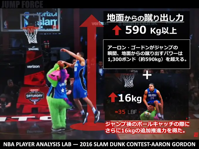 そのパワーでセダン一台分ほどの距離を飛び、滞空時間は約0.89秒に達します。これはマイケル・ジョーダンが1988年に見せたフリースローライン・ダンクと同等の滞空時間です。